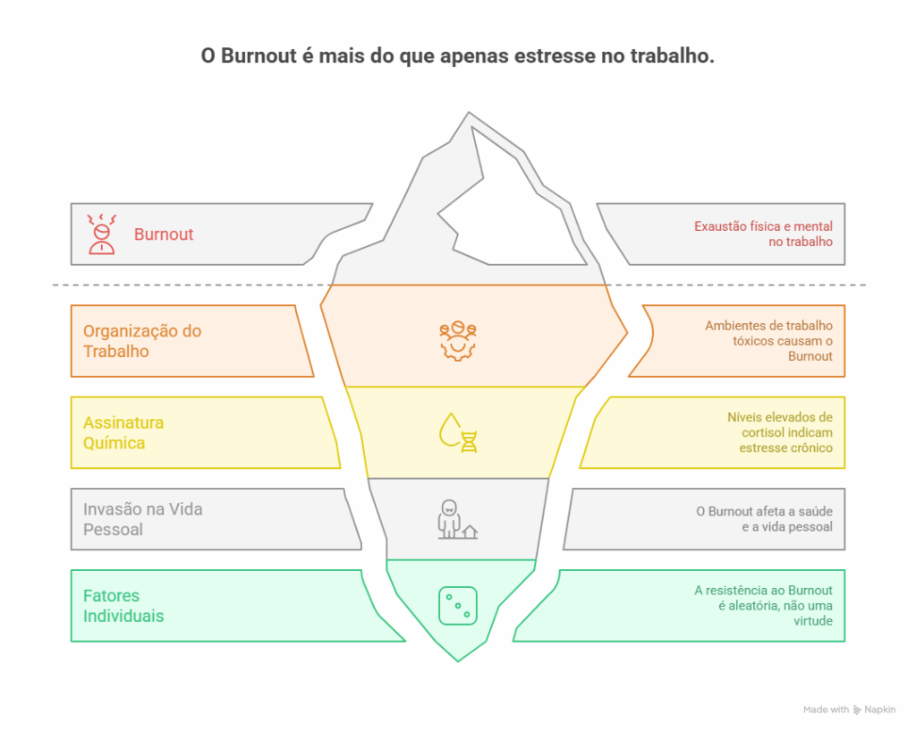 Primeiro: O Burnout só existe por causa do modo como o trabalho é organizado. Não aparece do nada – é fabricado em ambientes com pressão extrema, assédio, jornadas intermináveis ou falta de controle sobre suas tarefas.