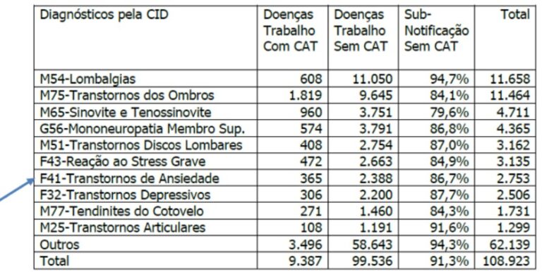 A situação é tão complicada, que os números na tabela da quantidade de doenças do trabalho, segundo os CID, retirada do anuário estatístico de acidentes de trabalho da previdência social são alarmantes: