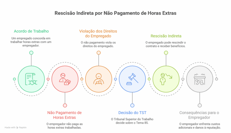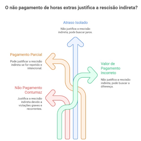 O não pagamento de horas extras não gera rescisão indireta automaticamente, mas é um direito seu quando a violação é repetida e comprovada.