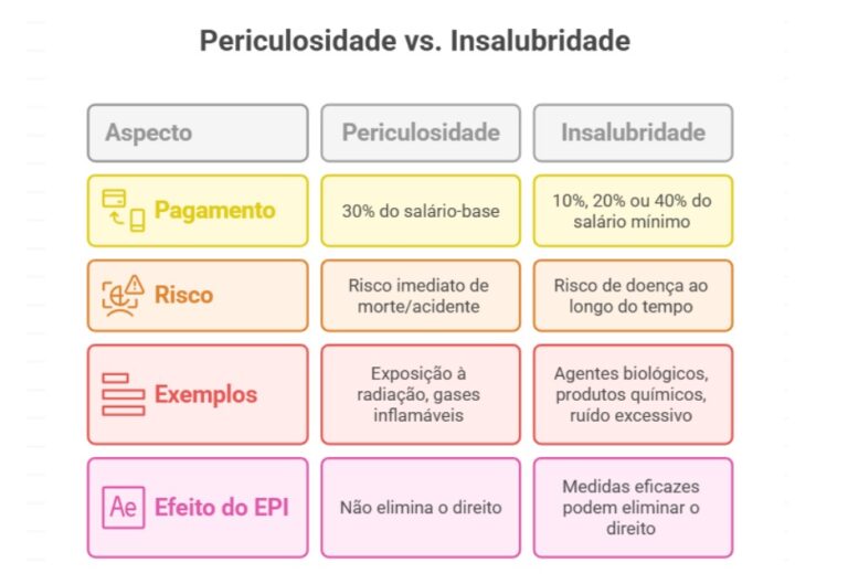 Como evidenciado anteriormente, a periculosidade é devida quando o trabalho envolve perigo imediato de morte ou acidente grave. Por outro lado, a insalubridade é paga quando o profissional está exposto a coisas que podem prejudicar sua saúde a longo prazo, como doenças ou contaminações.