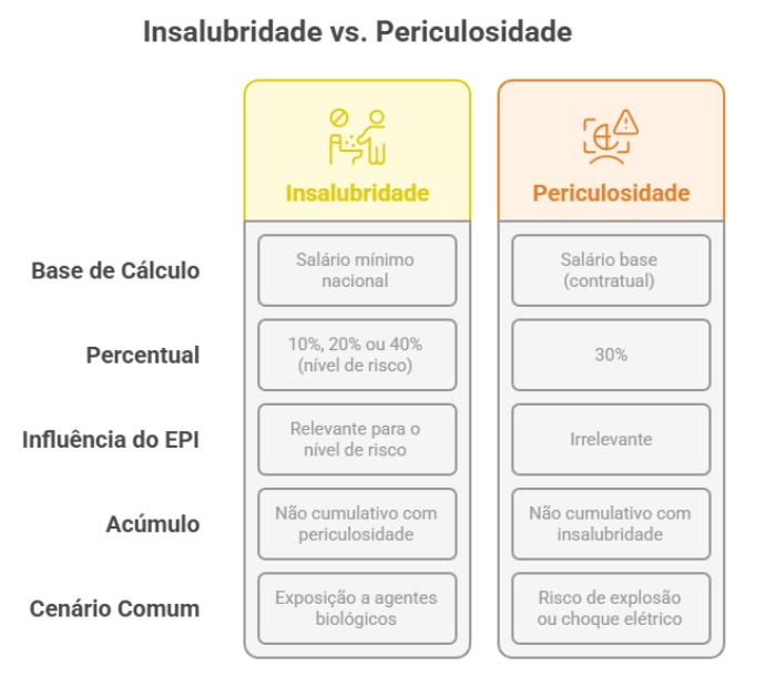 Comparando: R$ 3.000,00 (periculosidade) x R$ 580,80 (insalubridade máxima) — a diferença é brutal.